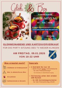 Am Samstag, dem 07. Februar 2026 ab 19.11 Uhr veranstaltet der TV Nieder-Klingen wieder seine Faschings-Partysitzung. Warm-up und Happy Hour gibt es von 19.11 Uhr bis 20.11 Uhr, bevor ab 20.11 Uhr das Bühnenprogramm beginnt. Selbstverständlich ist unser Publikum zwischen den Showeinlagen bei Partymusik mit DJ zum Feiern eingeladen.