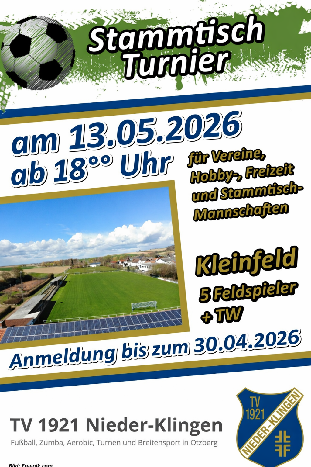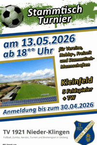 Der TV Nieder-Klingen veranstaltet am Mittwoch, dem 13. Mai 2026 (Tag vor Christi Himmelfahrt) in den Abendstunden ab 18.00 Uhr ein Turnier für Hobby-, Freizeit- sowie Stammtisch-Mannschaften und wir hoffen, Ihr habt wieder Lust, bei uns mitzumachen!
