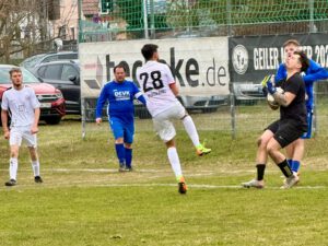 Nach diesem Treffer gab es in der SG-Defensive eine Umstellung und fortan lief es etwas besser für das Klinger Team. Ein erster Lichtblick war ein direkter Freistoß für die SG in der 13. Minute, den Kapitän Sven van der Elst aus 16 Metern durch die Mauer zum 3:1 verwandelte. Die Platzherren waren jedoch weiterhin die dominierende Mannschaft. Robin Kabus im Kasten der SG musste mehrere Male beherzt eingreifen. So verhinderte er gegen Marlon Garcia und Simon Teuchner weitere Einschläge.